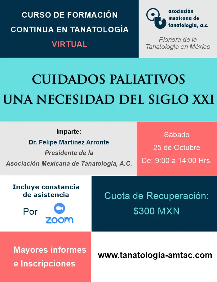 La Asociación Mexicana de Tanatología, A.C. (AMTAC) organizó el curso de formación continua en tanatología "Descubriendo lo mejor de mí", una jornada virtual intensiva enfocada en el autoconocimiento y el desarrollo personal. Impartido por la reconocida tanatóloga María Carmen de Fátima Calderón Hinojosa, el taller, que tuvo lugar de 9:00 a 14:00 horas vía Zoom, se distinguió por su metodología dinámica y práctica, priorizando la reflexión personal sobre la teoría extensiva.